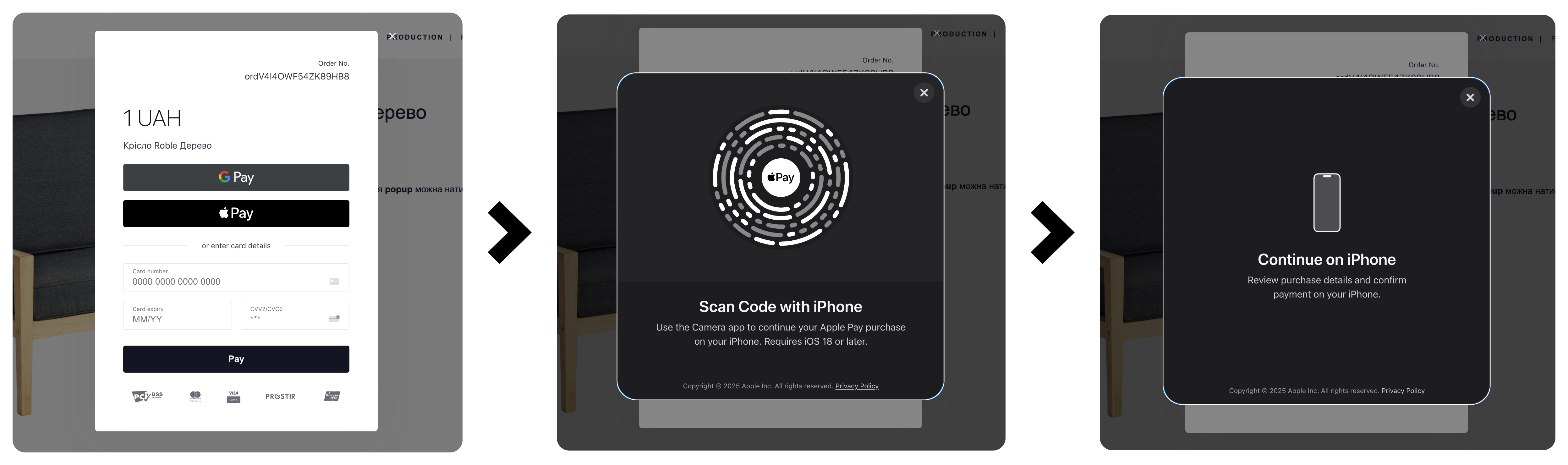 The payment process when the checkout/payment widget is opened from an Apple mobile device works similarly to how it functions in the Safari browser (without the need to scan a QR code).